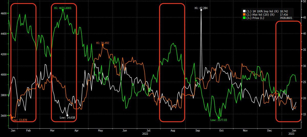 In the red boxes you can see that the spread between IV and RV compress as the market peaks.