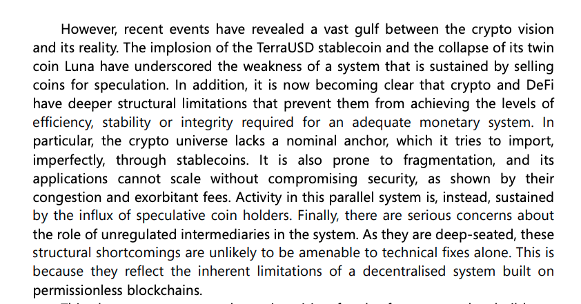 2/ "The implosion of the TerraUSD stablecoin and the collapse of its twin coin Luna have underscored the weakness of a system that is sustained by selling coins for speculation." (p. 76)