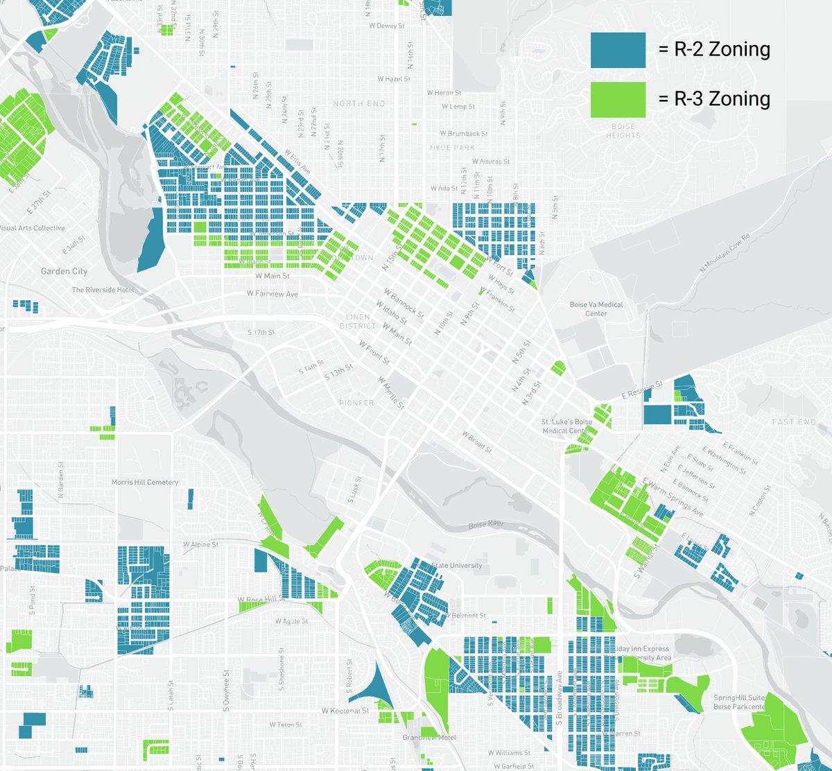 Boise's R-2 (Medium Density) and R-3 (High Density) zoning districts are our residential districts that allow for higher density development in safe neighborhoods. We have a fair bit of it within reach of Downtown!