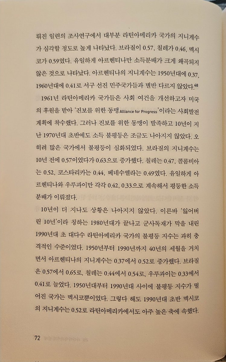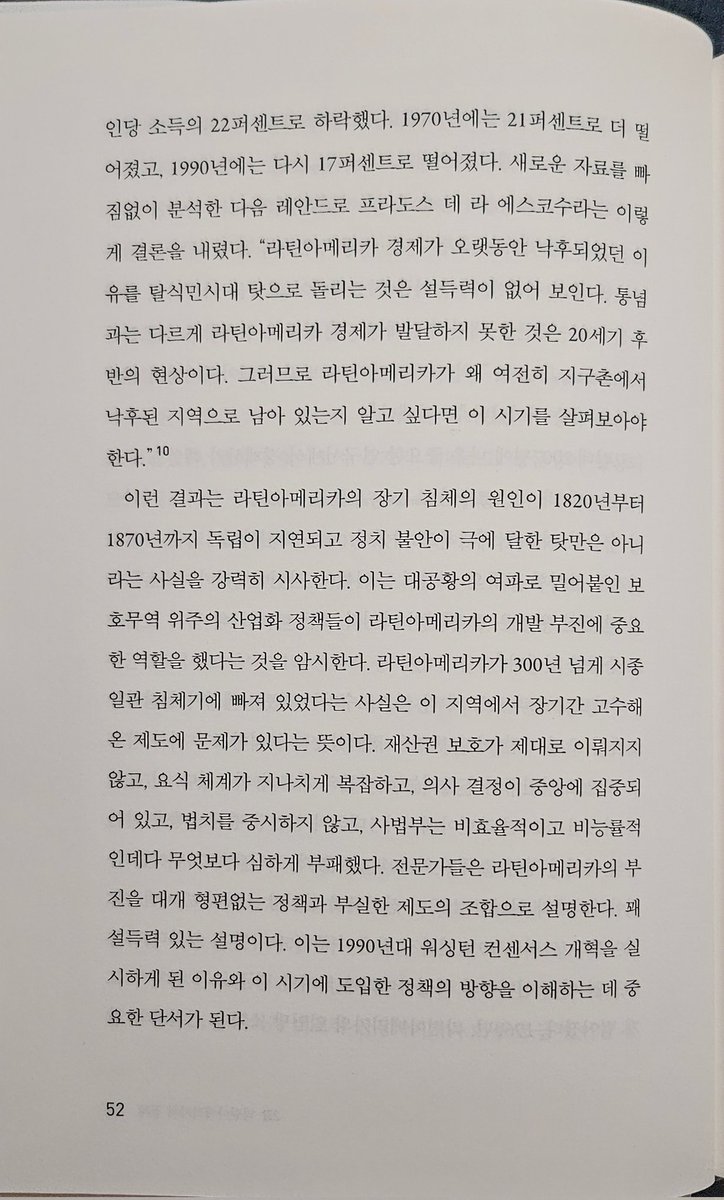 슘페터 경제이론 경제분석의 역사 읽고만다... 라틴 아메리카의 경제가 대지주 중심으로 수탈적이었던 것이 하루이틀 일은 아니지만, 그래도 서구에 대한 국민소득 비중이 더 나았던 순간들은 있었다. 그리고 이는 2차대전 이후 악화일로를 걸었고. 단순히 산업화의 문제만이 아니다. 에쓰모을루 등 제도학파는 스페인 식민지 지배시절 수립된 제도적 특성이 이후 경로의존성을 갖고 이 지역을 지배했다고 설명하지만, 그 접근이 정치 레벨에서 충분히 미시적인지에 대해서는 조금 보충이 필요해보인다.