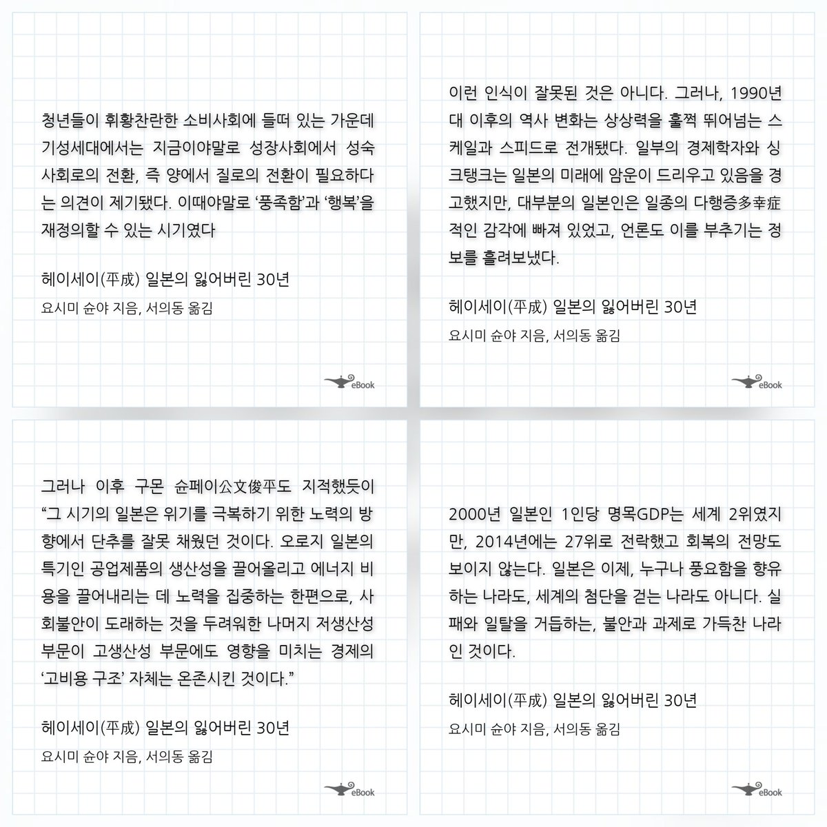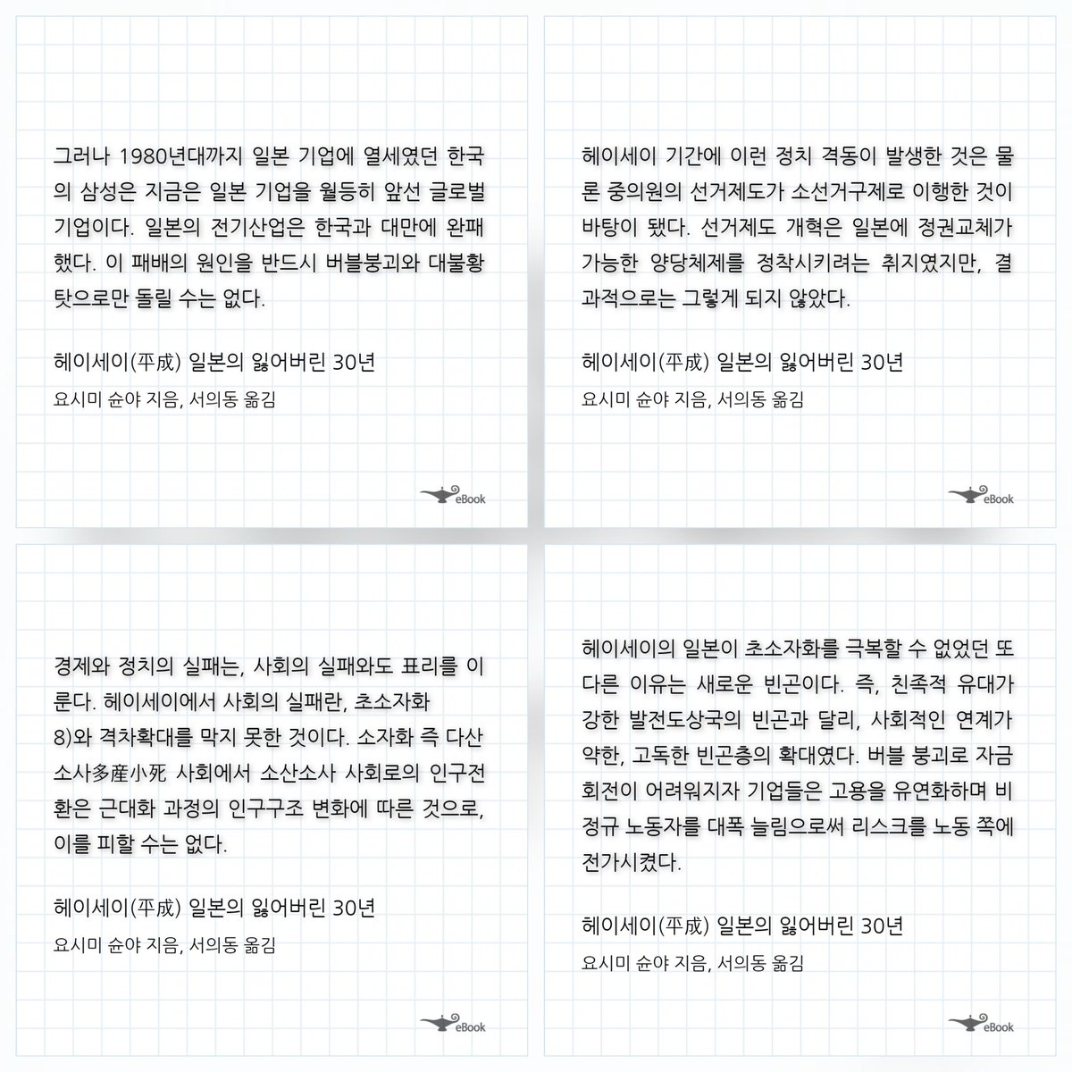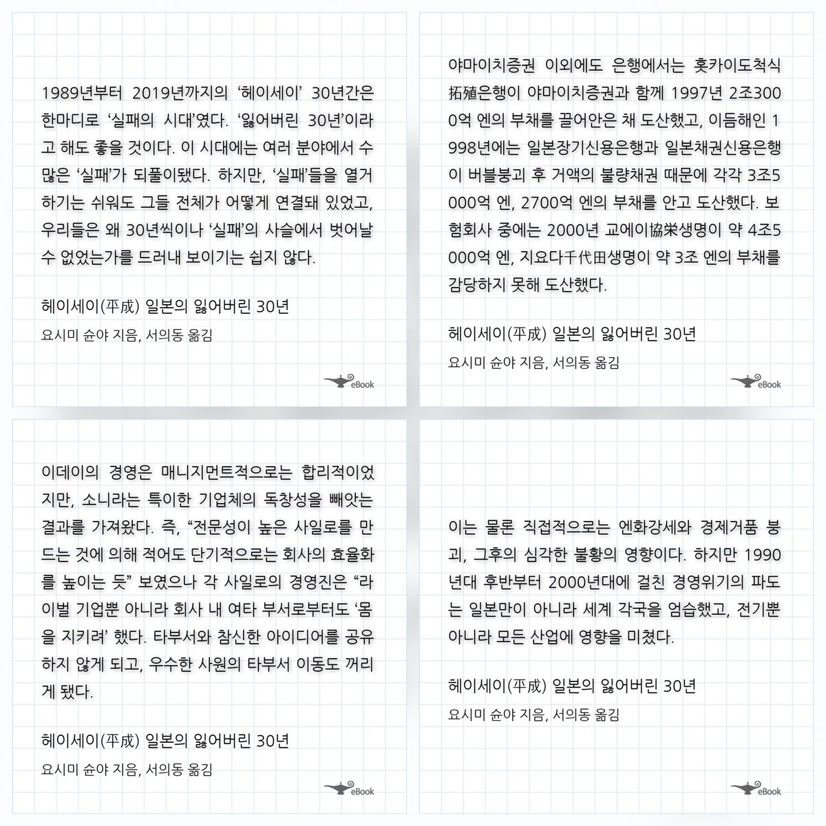 헤이세이의 대침체란 무엇이었나. 그것은 경제적으로는 여러번의 쇼크였고, 지속적인 기업의 실패였으며, 제조업의 공동화였고, 금융 부실의 파탄이었다. 금융사들의 부실이 야마이치 증권으로부터 훗카이도 척식으로, 일본 장기신용은행과 일본채권신용은행으로, 교에이 생명과 치요다 생명의 도산으로 나타난다. 도시바로부터 산요, 소니 등 전자회사들의 점유율과 부실은 제조업의 침체를 드러냈다. 이는 단순히 외생적 쇼크로 인한 것이 아니라, 시대적 흐름을 읽지 못하고 기존의 체제를 고수하며 경영적 판단의 실패가 연속적으로 누적된 결과이기도 하다. 동일한 아시아의 쇼크로부터 한국과 대만의 반도체와 전자산업이 약진하고, 일본이 밀려난 것은 그 증명이다.