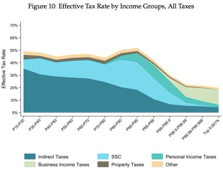Quando somamos todos impostos, sobre renda e consumo, a carga tributária paga pelos nossos milionários é de apenas 20%, o que representa menos metade da carga suportada pelo brasileiro mediano (42%) e também menos do que pagam milionários de outros países (36% nos EUA)…