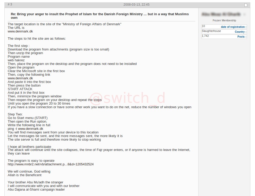 In 2008, members of a jihadist forum launched a ddos attack against the Danish Foreign Ministry website.