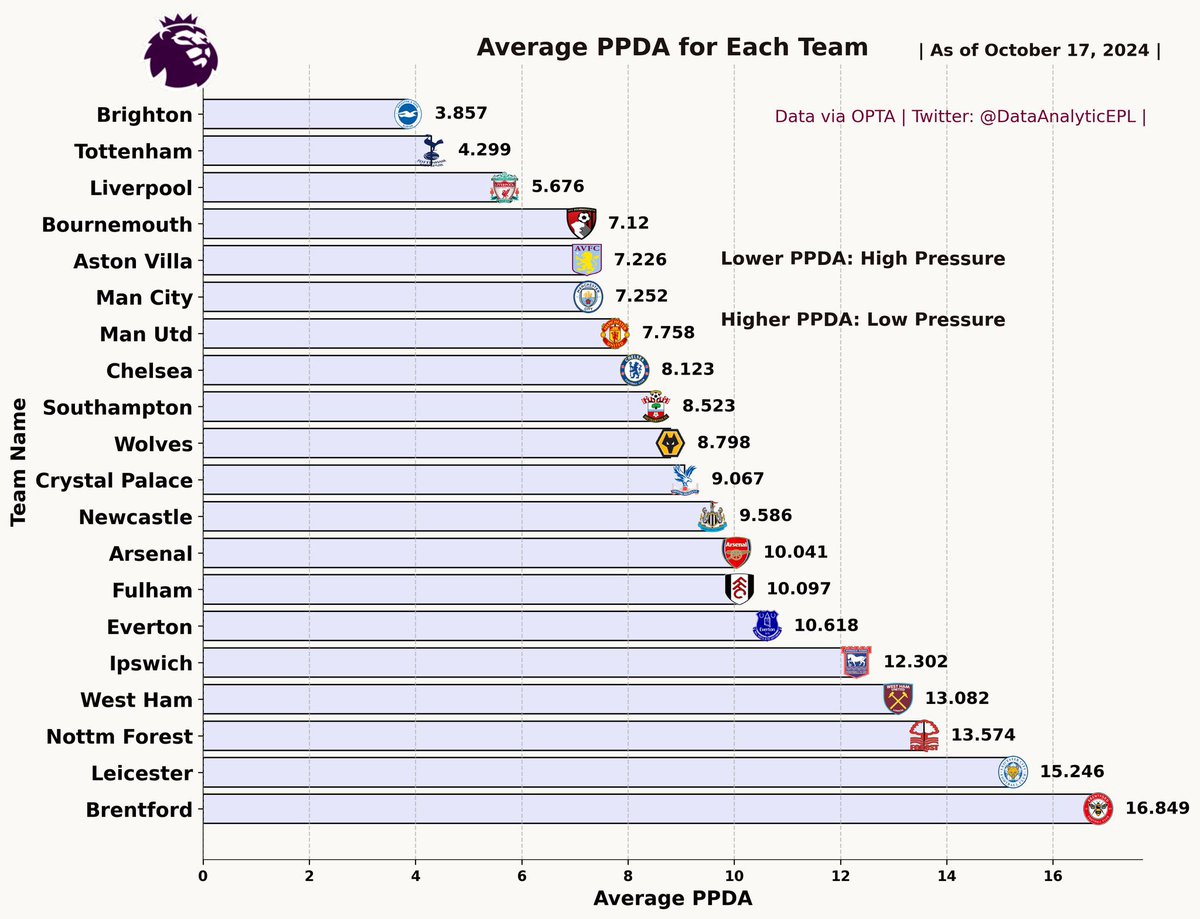 At 16.8, Brentford’s PPDA (passes per defensive action) is the highest in the PL and 2x the league median, indicating a low press and usually no intent to stop opposition build up: