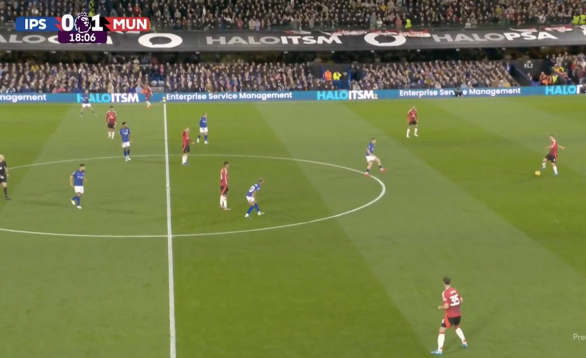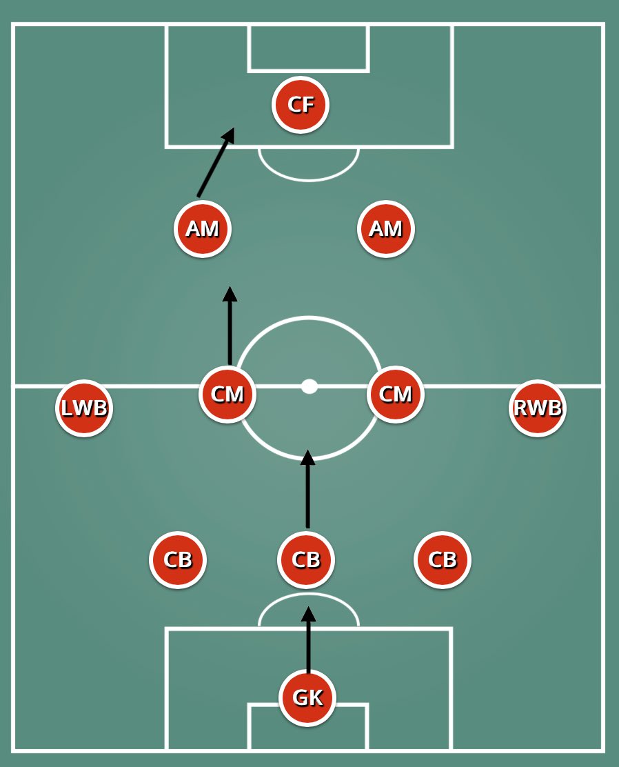 Here is Onana, in one of our first settled possessions, forming a back 3 with Evans and Maz, with a Case - MDL pivot in front of them.