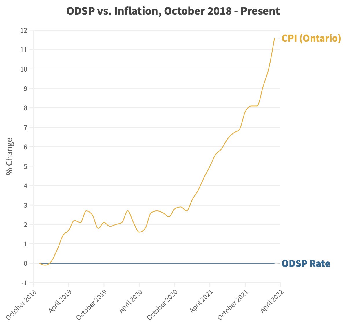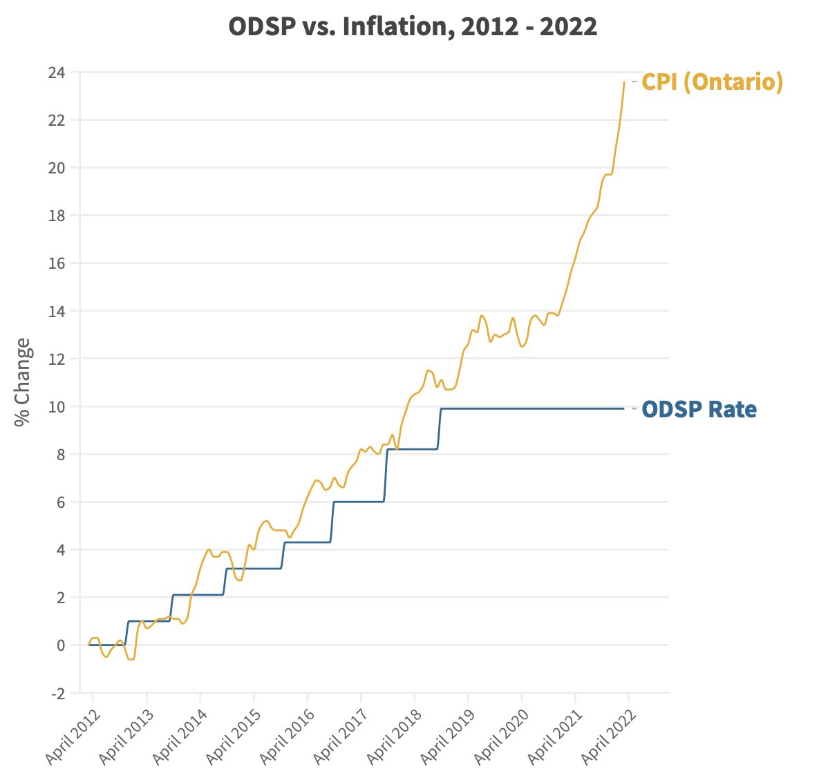 Looking back further, we see that ODSP had moved in lockstep with cost of living from 2012-2018 before uncoupling. Had ODSP kept pace with CPI over the last 10 years, it would be at $1315/mo instead of $1169/mo.