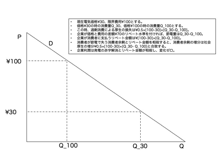 単純に価格=限界費用とするダイナミックプライシングでも同じ社会厚生が得られますが、分配問題として考えるとリベート方式の良いところは社会厚生の増分が消費者余剰の増分と合致することです。だから消費者に人気があります。弱点は損失回避が働かないので節電量は小さい。