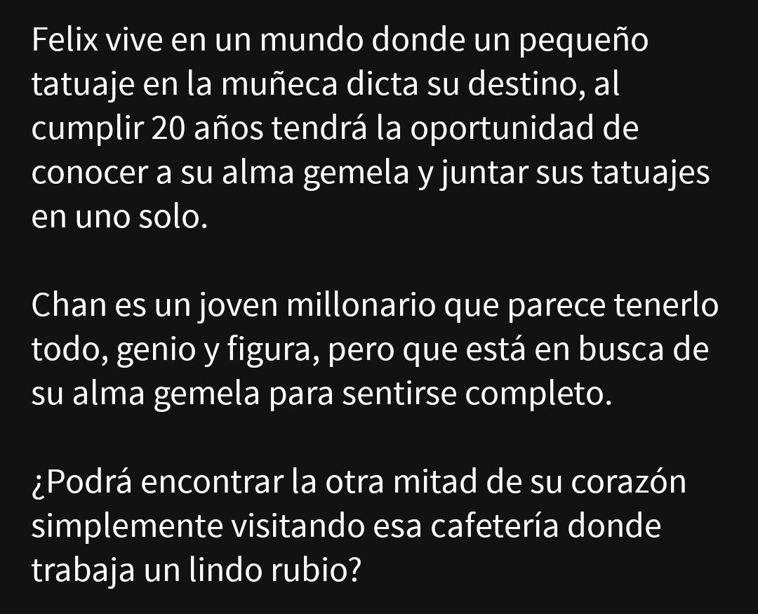 ❐↬Un tatuaje en la muñeca dicta el destino, al cumplir los 20 años, se tiene la oportunidad de conocer a su alma gemela y juntar sus tatuajes en uno solo.