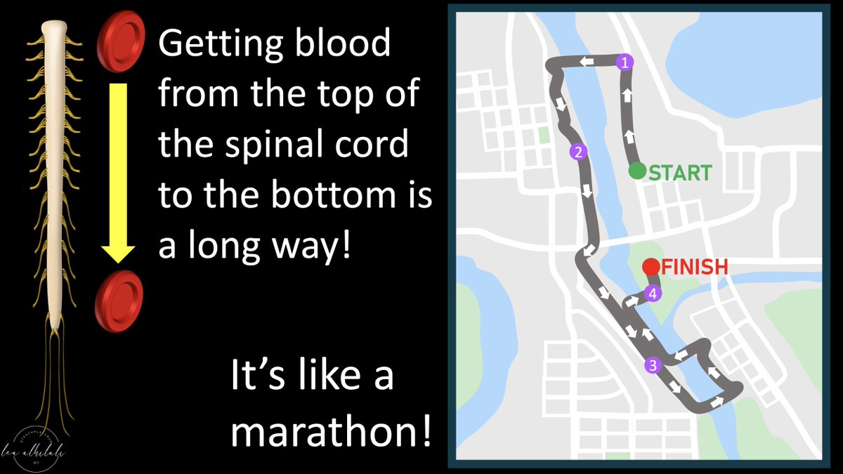 The spine is LONG—to get blood from the top to the bottom is like going through the length of a marathon course