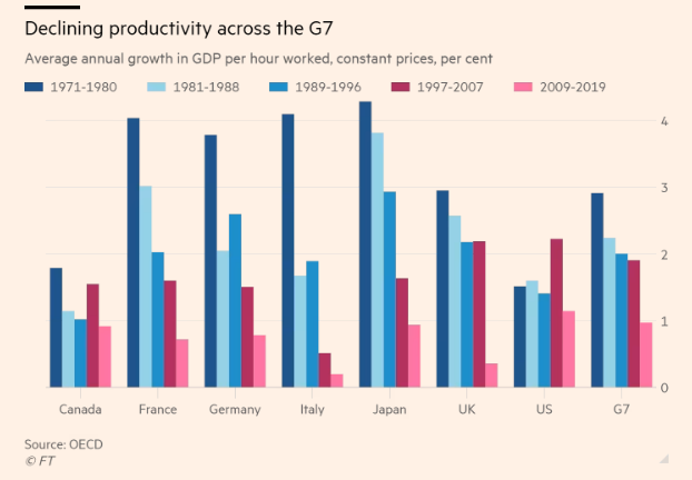 Productivity growth is slowing across the G7. We know how to raise productivity, but could our inability to do so be a function of becoming rich and democratic? Three dynamics stand-out: 2/9