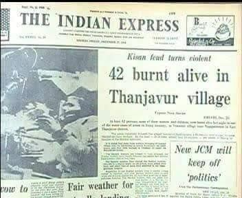 On 25 Dec 1968, 44 landless Dalit agricultural labors were burnt to death by the army of landlords at Keezhvenmani village, Tamil Nadu, India. The privileged caste Gopalakrishna Naidu, mastermind of gruesome act got acquitted by court & murdered by one of the Victim's relative.