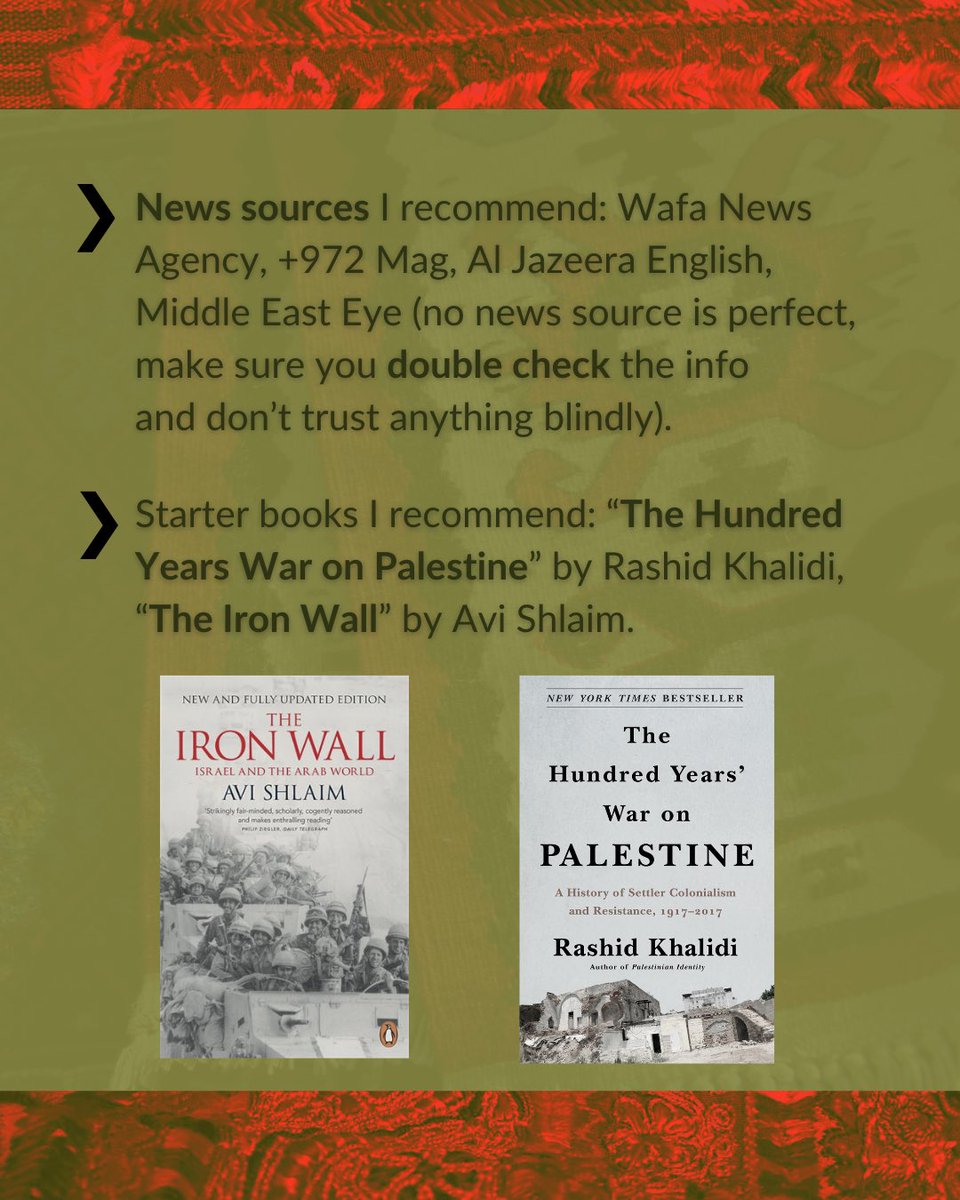 Your work begins with building an understanding of the past and present of this conflict. Read up on the history, keep up with news, make sure to get information from a varied list of sources and don’t doomscroll too much. Follow local Palestinian journalists and activists. Share information around, talk to your friends about it.