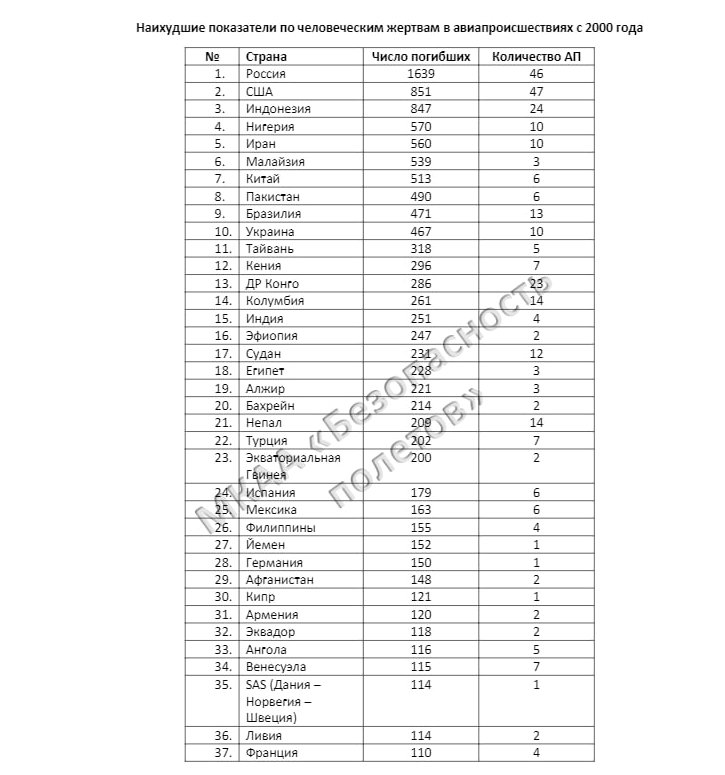 Сейчас в России худшая в мире безопасность полетов. В мае 2022 года МКАА «Безопасность полетов» опубликовало рейтинг стран по человеческим жертвам в авиакатастрофах с начала XXI века. Россия на первом месте с 1639 погибшими. [2/14]