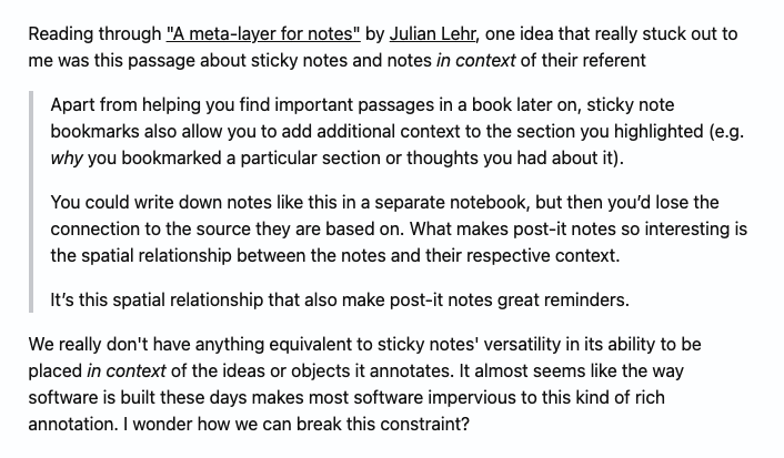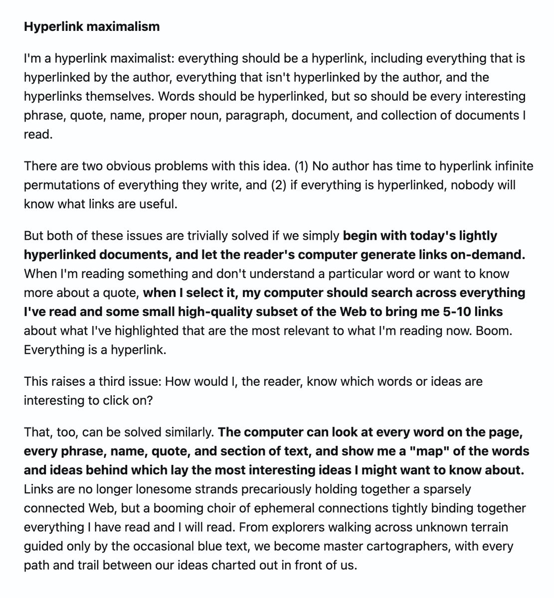 As computers become superhuman at understanding language, I think it'll become more and more foolish to build knowledge tools that depend solely on human authors to make connections between everything you know and read.