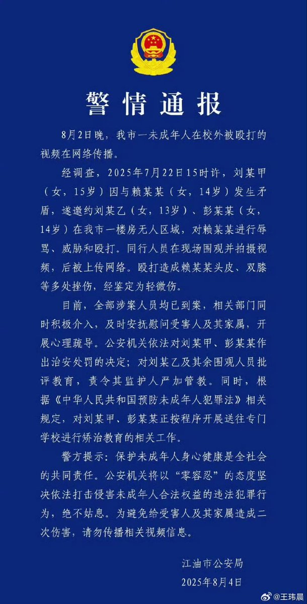 The two perpetrators aged 14 and 15 were respectively given 13 days and 10 days of detention and fines by the police, while the other 13-year-old perpetrator was exempted from punishment due to being under 14 years old and was handed over to her parents for education.