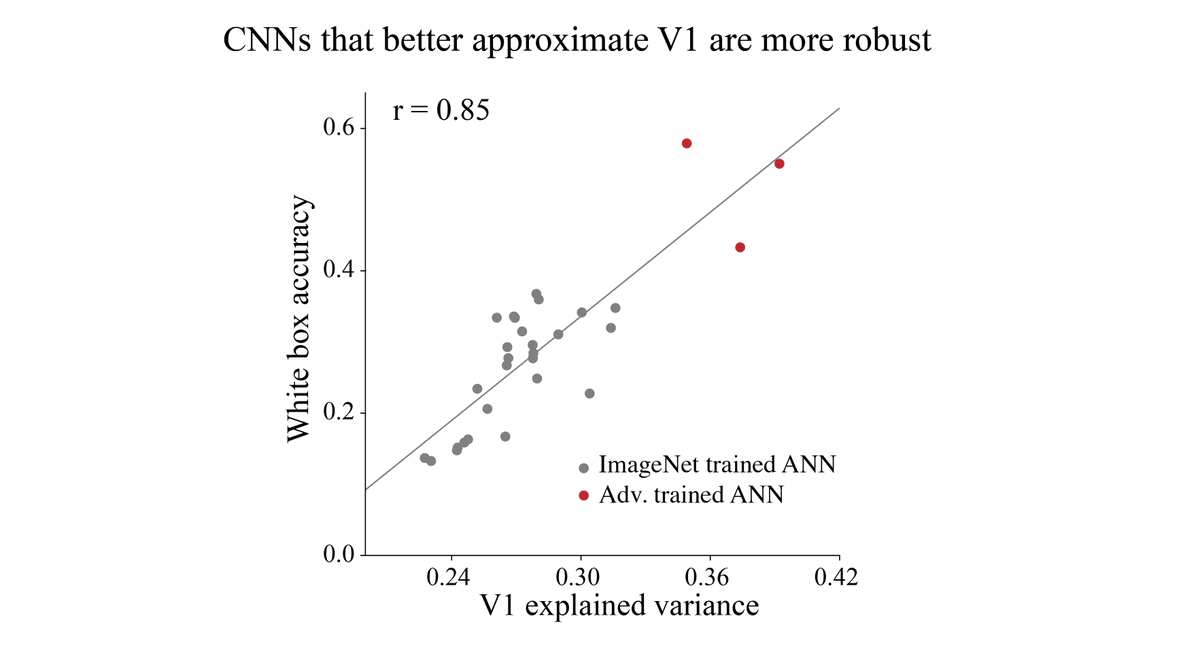 This work was the result of an unexpected collaboration. Joel discovered that the ability of CNNs to explain V1 responses was correlated with their adversarial robustness. Particularly, adversarially trained models [@aleks_madry] had the most V1-like representations.