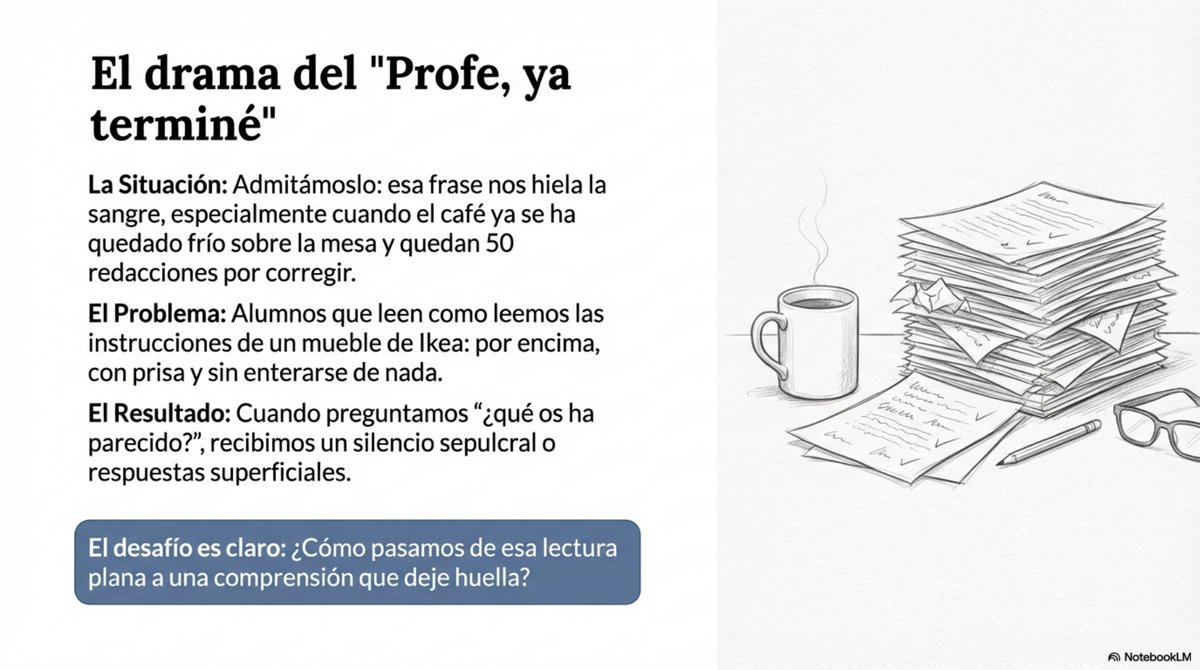 El drama del "Profe, ya terminé" a los 2 minutos... 😅 Todos lo hemos vivido. Leen con prisa, como si fueran instrucciones de Ikea. El resultado: silencio sepulcral al preguntar. ¿Cómo cambiamos esto? 👇