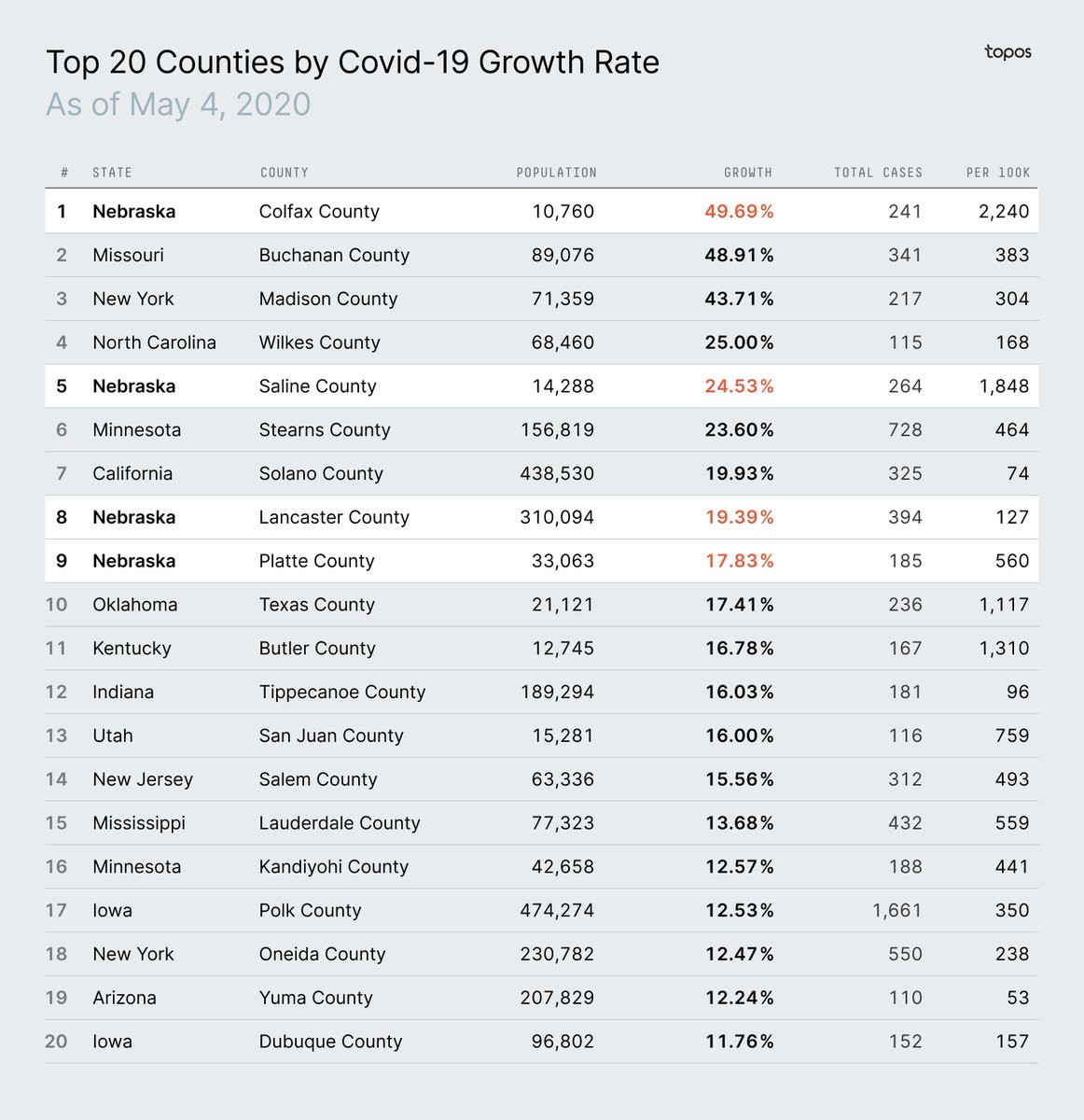We used county-level data to identify where in the country the growth of new #COVID19 cases is the highest. The top 20 across the nation are shown in the table below. We immediately noticed that #Nebraska has 4 out of the top 20 counties with the highest growth rates.