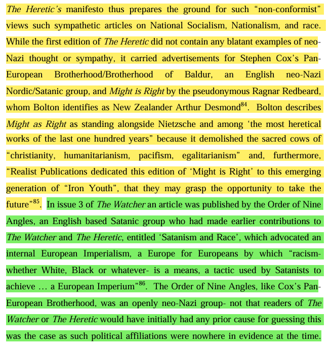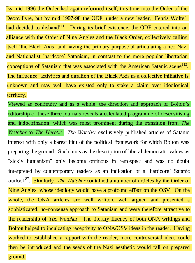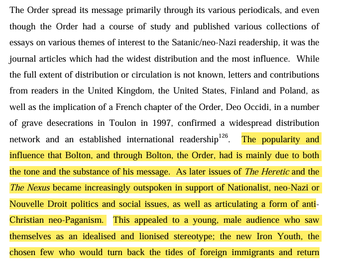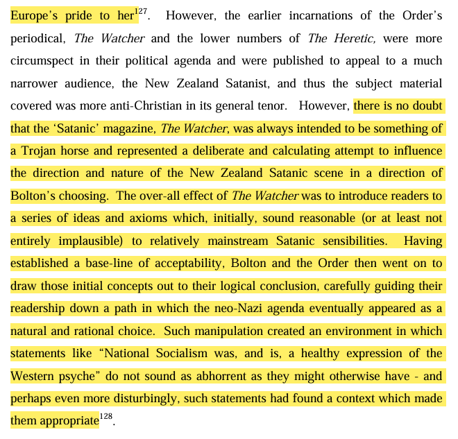 2/4 Bolton's journals, The Watcher & The Heretic, functioned as tools of radicalization, desensitizing & indoctrinating young men. The publications initially presented anti-Christian and non-conformist Satanic views to build a baseline of acceptability within the subculture.