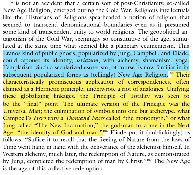 This Eranos kind of public gnosis, popularized by Jung, Campbell, and Eliade, could espouse its identity, seriatum, with alchemy, shamanism, yoga, Templarism. Such a secularized esoterism, of course, is now familiar in its subsequent popularized forms as New Age Religion.