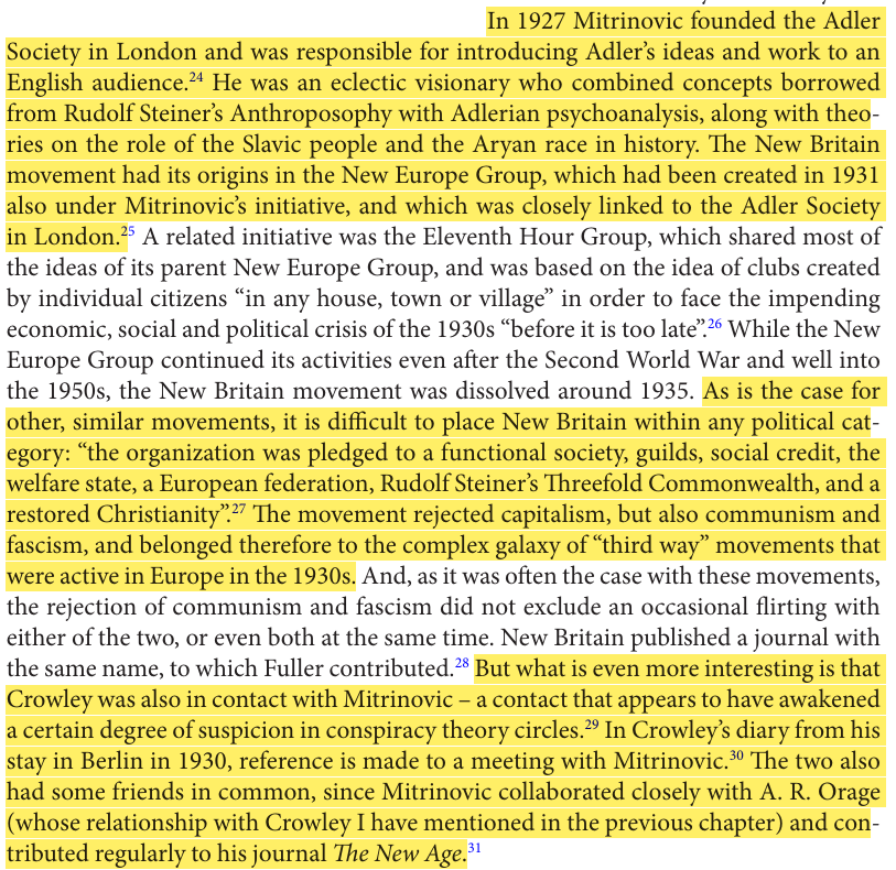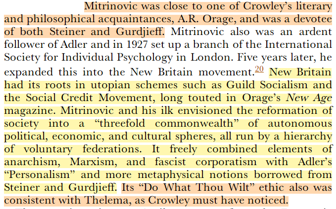 The New Britain movement promoted Social Credit, and its "Do What Thou Wilt" ethic was consistent with Thelema, as Aleister Crowley must have noticed.
