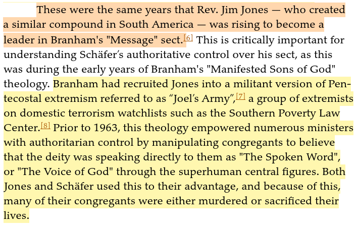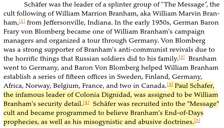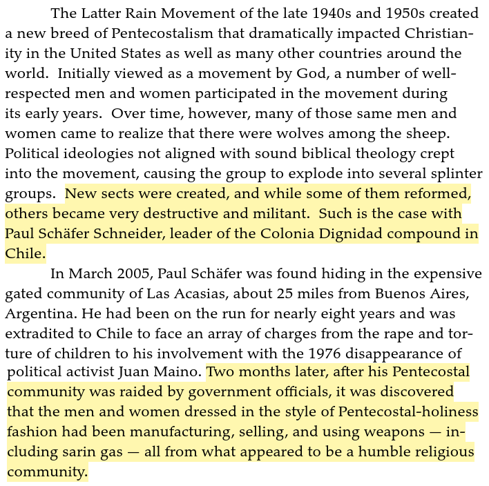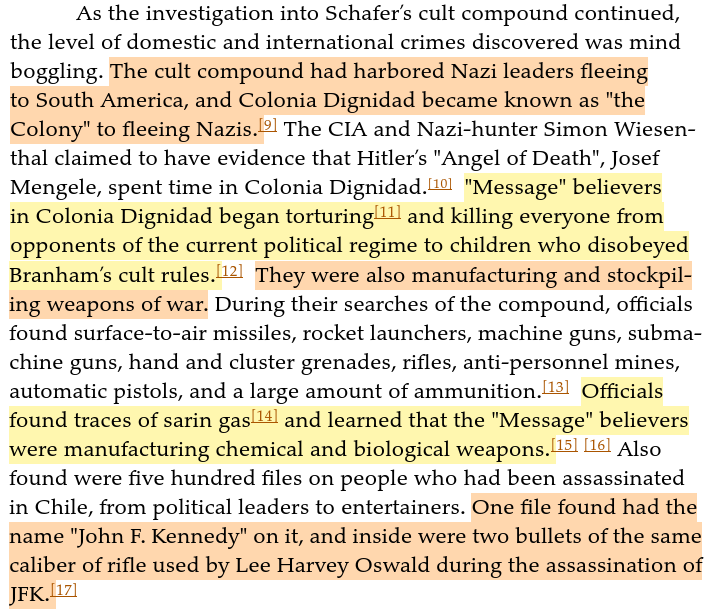"Message" believers at Colonia Dignidad stockpiled surface-to-air missiles & other weapons while producing chemical & biological agents including sarin gas. Officials also found a file labeled "John F. Kennedy”" containing 2 bullets matching the caliber used by Lee Harvey Oswald.