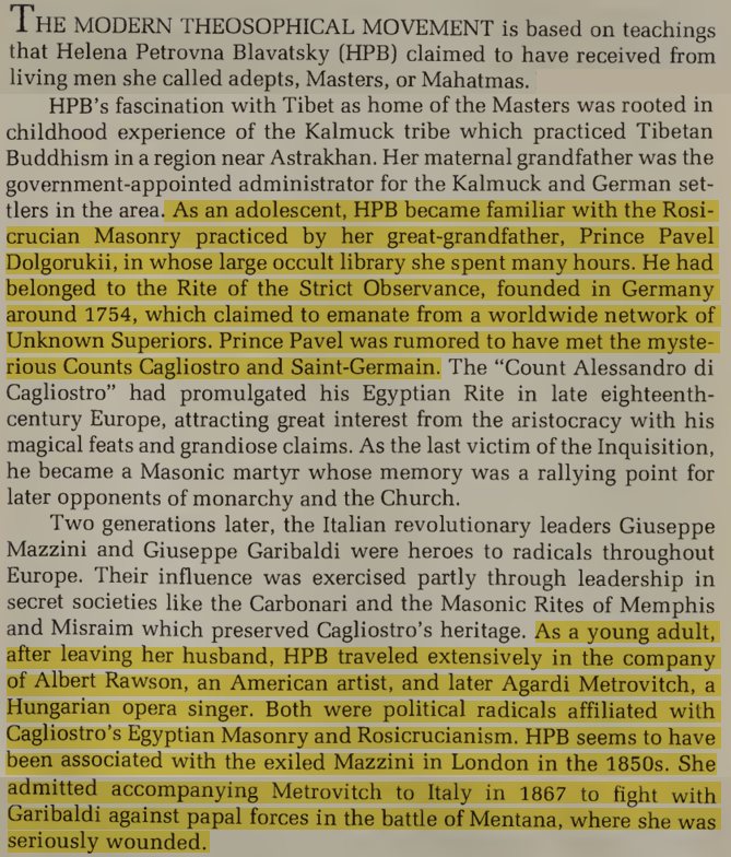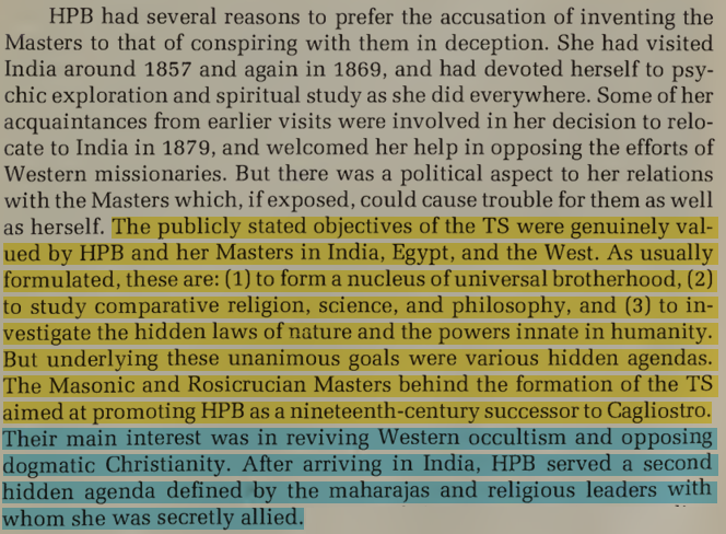 The Masonic and Rosicrucian Masters behind the formation of the Theosophical Society aimed at promoting Madame Blavatsky as a nineteenth-century successor to Cagliostro. Their main interest was in reviving Western occultism and opposing dogmatic Christianity.