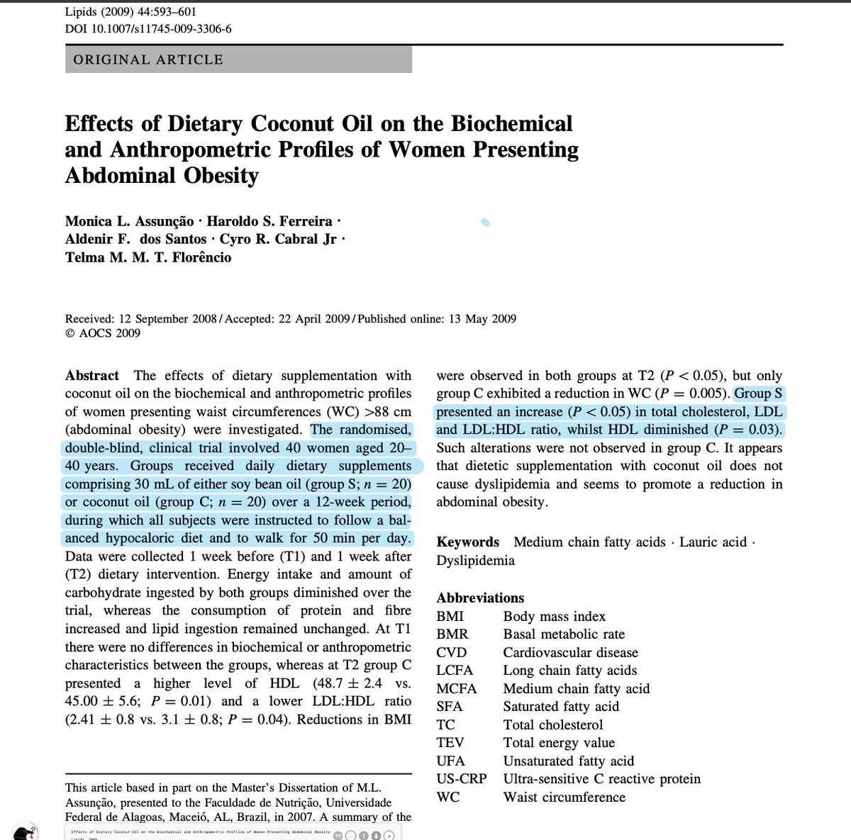 This trial looked at women is abdominal obesity. Half used coconut oil and half used soybean oil, supplemented for 12 weeks and instructed to eat a hypocaloric diet.
