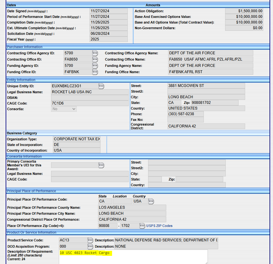 Rocket Lab was awarded a $10M contract by AFRL late last year (with $1.5M obligated so far) for the Rocket Cargo program