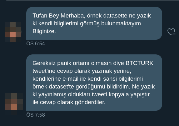 Sonra millet çıkıyor bana karalama diyor. Farkında değil ev adresinin, telefonunun ve fotoğrafının ortalıkta dolaşınca başına neler gelebileceğinin. Tek istediğim farkındalık yaratıp, #btcturk'un güven veren teknik açıklamalar yapması. Kendinizi bu kullanıcının yerine koyun++
