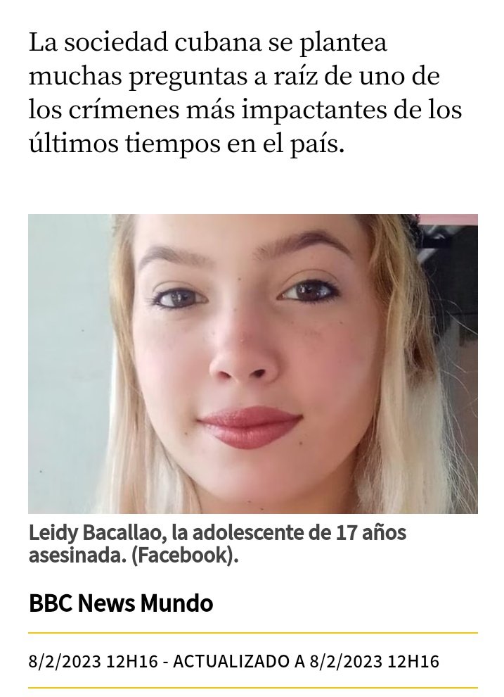 El 7 de febrero del año pasado, Leidy Bacallao, una adolescente de 17 años, fue asesinad4 a puñaladas por su expareja en una estación de policía de #Cuba, donde había acudido a denunciarlo por acoso y amenazas 😢 EPD