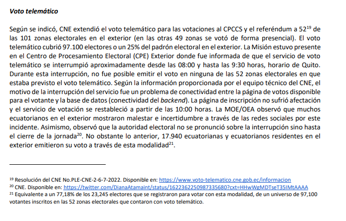 https://twitter.com/radio_pichincha/status/1666468874114531329Hubo un piloto para voto en el exterior en las recientes elecciones de 2023. De momento no he encontrado informes técnicos del CNE sobre el monitoreo de su funcionamiento. La Misión de Observación Electoral de la OEA sí hizo algunas observaciones: oas.org/fpdb/press/Inf…
