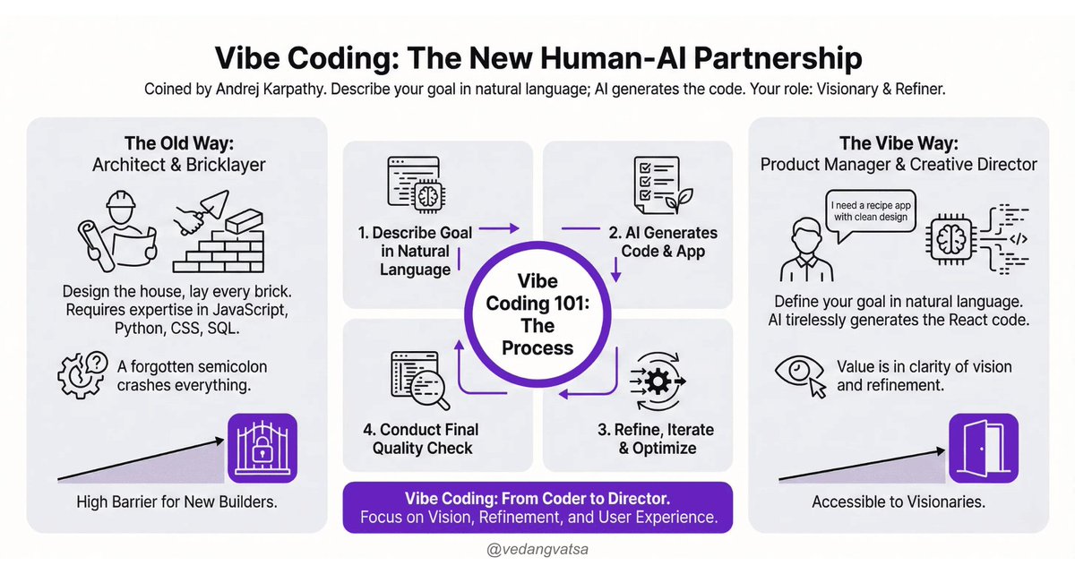 The term “vibe coding” comes from AI researcher Andrej Karpathy. Instead of writing code line-by-line, you describe your goal in plain language, and the AI generates the app.