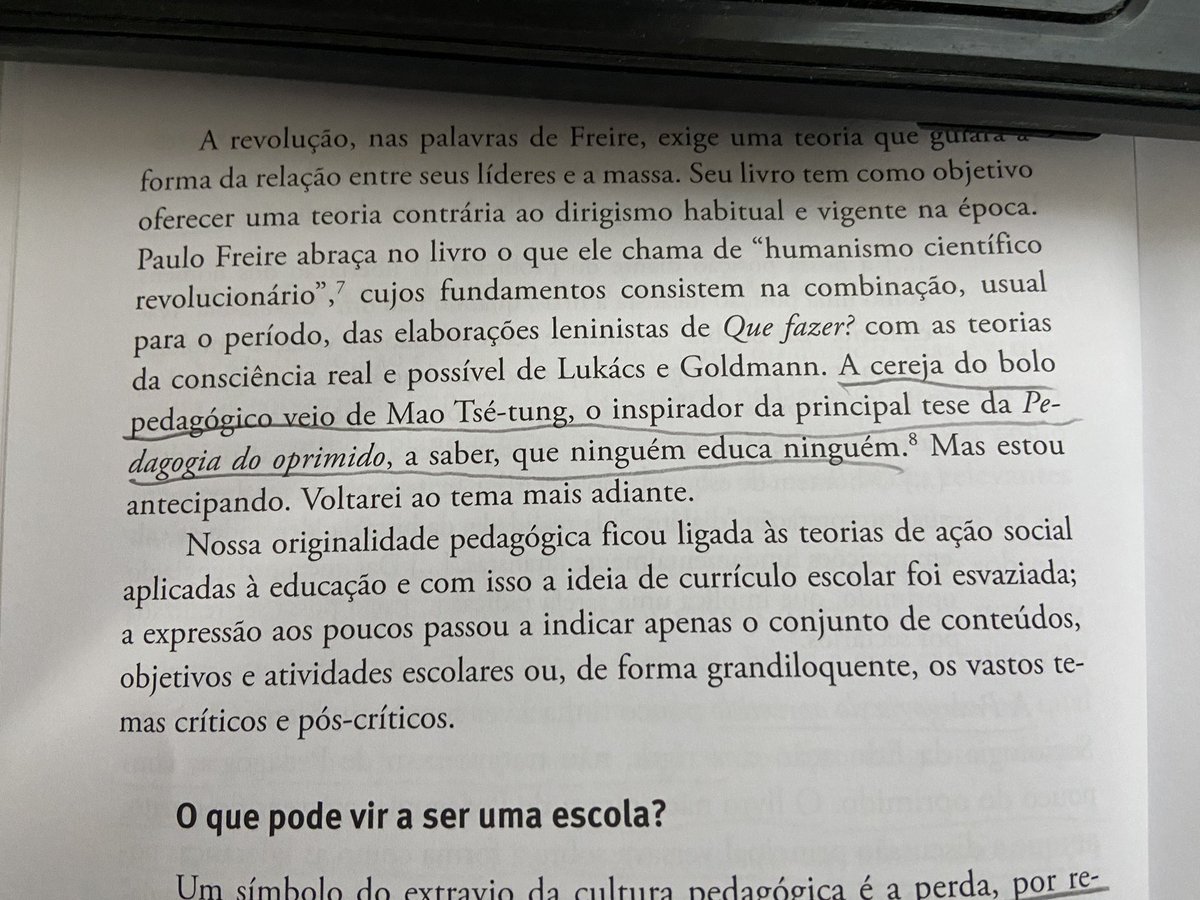 https://twitter.com/velhoprofessor/status/16681760604819537972/7 Na pag. 213, Freire prega “campos de reeducação” para os profissionais técnicos que são necessários. E ele diz isso dando a entender q esses profissionais não podem ser descartados: