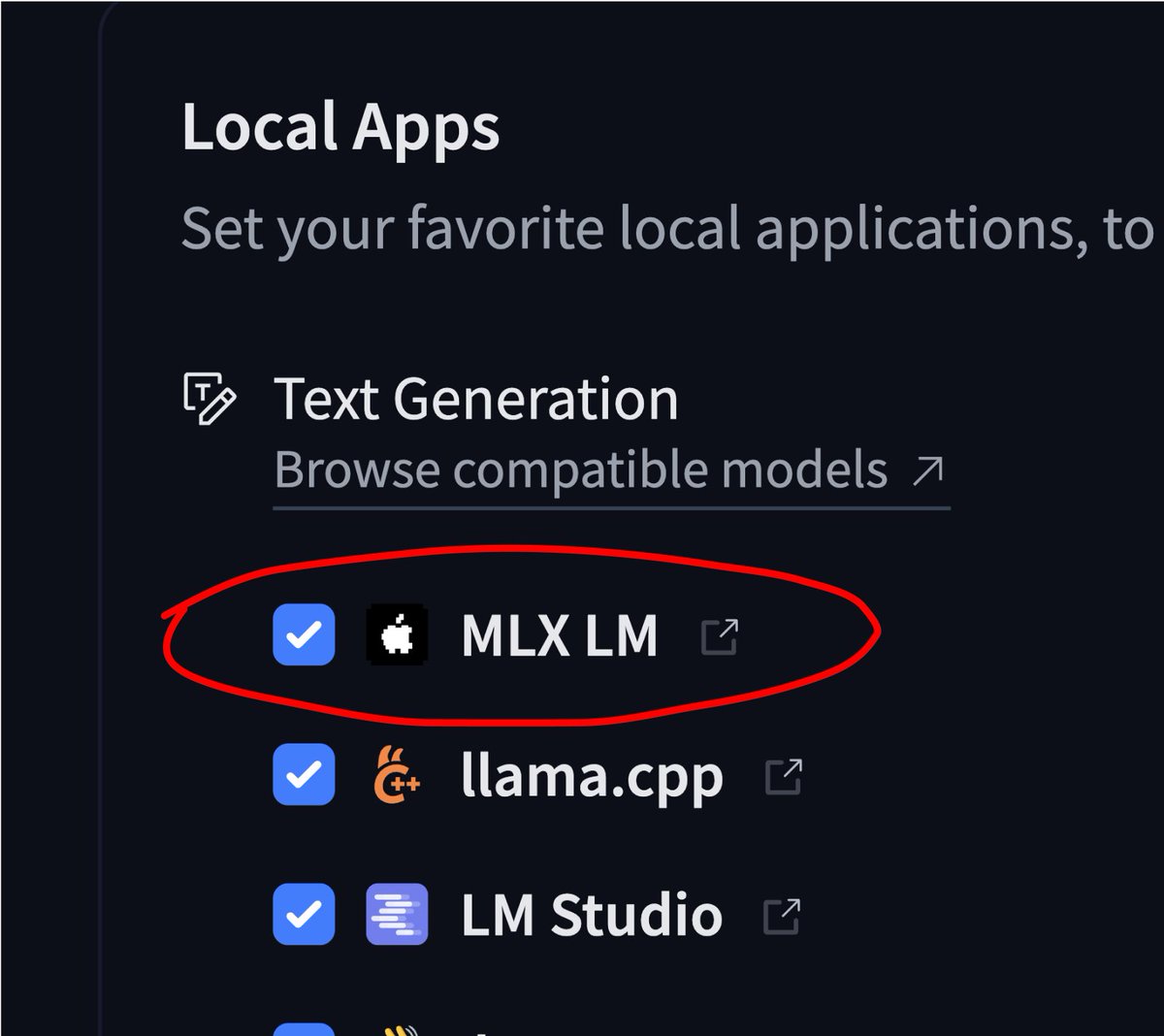 You need to toggle MLX LM in your local apps settings: huggingface.co/settings/local…