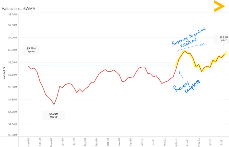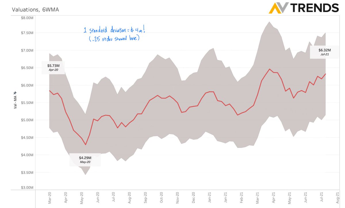 https://twitter.com/will_bricker/status/1422994341681901571One key point I want to make is that while the market moves up or down, on the whole, there is still a lot of variation! Looking at the graph from last time, you can see that one standard deviation is $4M even within the US market.
