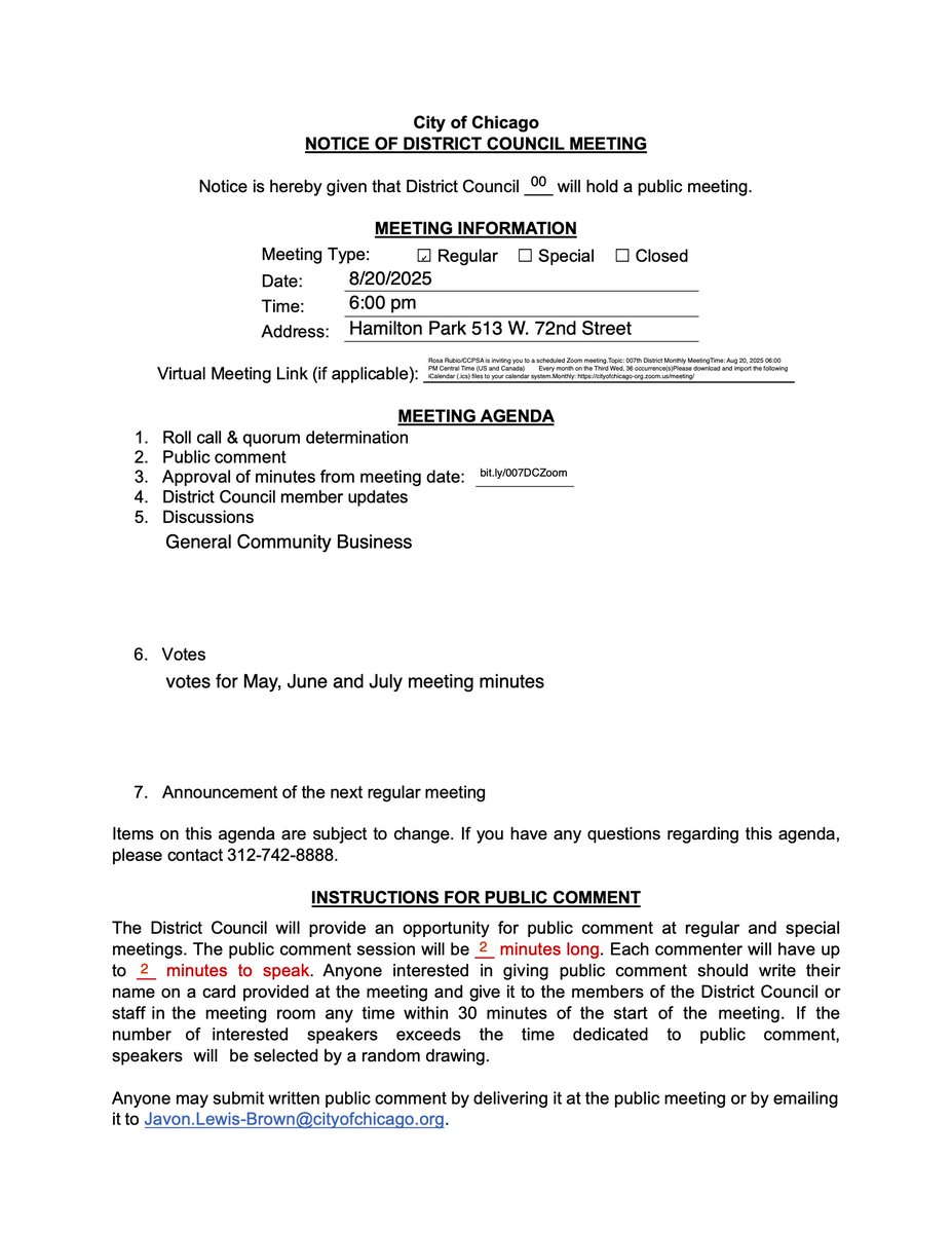 Anyone may submit written public comment by delivering it at the public meeting or by emailing it to Javon.Lewis-Brown@cityofchicago.org