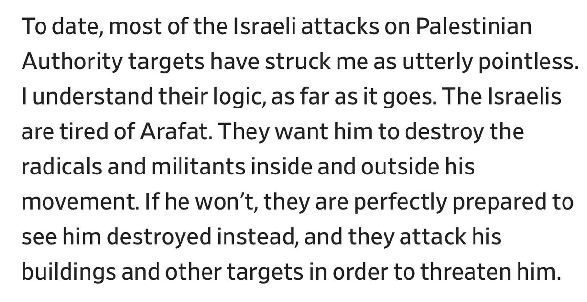 "Większość dotychczasowych izraelskich ataków bombowych w Palestynie jest uderzająco bezsensownością. Jasne, rozumiem ich logikę. Izraelczycy mają dość Arafata. Domagają się, by zniszczył radykałów i są gotowi zniszczyć jego, jeśli tego nie zrobi, stąd obecne bombardowania" 2/
