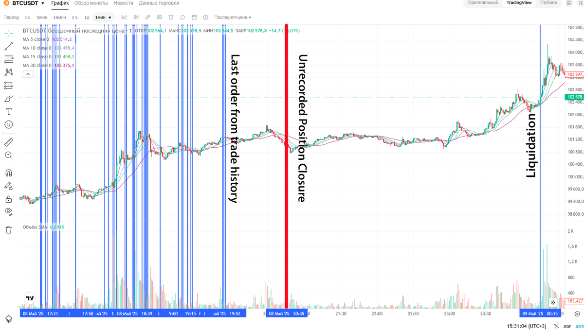 The closed position, not recorded in the logs, is fully confirmed by circumstantial evidence – the trade chart speaks for itself: frequent trades were recorded until the final trade, and then a 4‑hour pause followed up to the liquidation.
