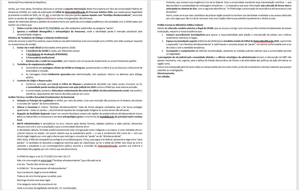 @MPF_PGR @UFAM_ A Lei 12.711/2012 fala apenas em "autodeclarados pretos e pardos". A UFAM, por edital, ACRESCENTA uma exigência ("fenótipo afro") que a lei não faz.