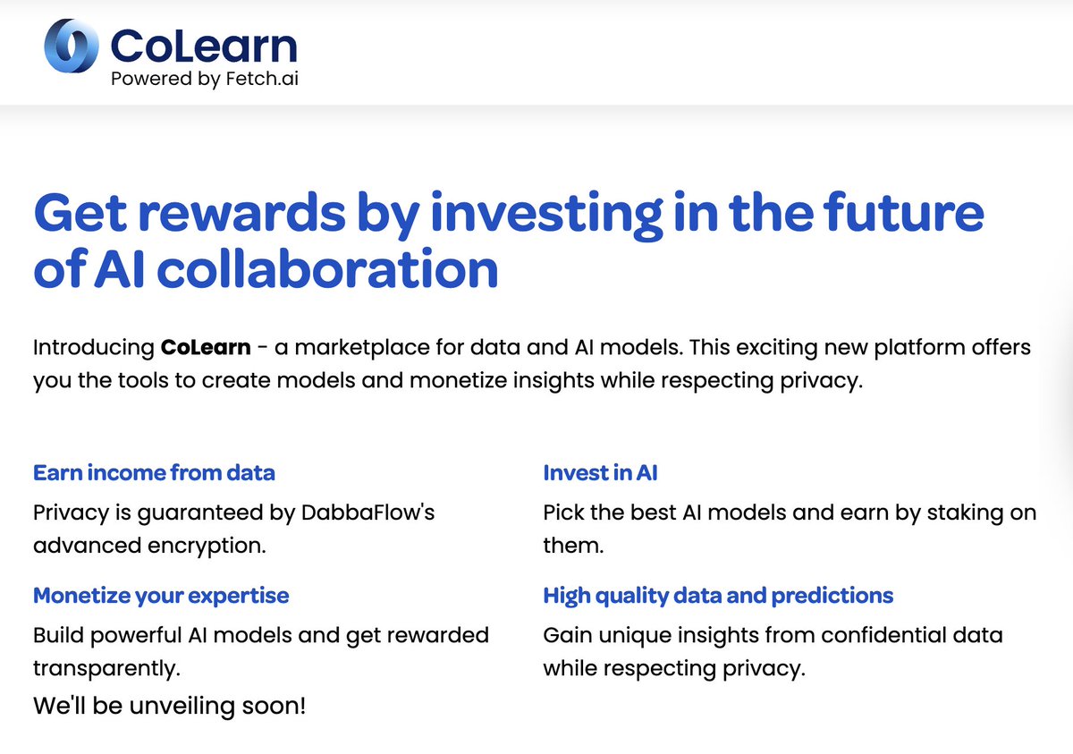 2)FET.AI @Fetch_ai: 基于Cosmos SDK实现了一套链间协议,架构上分为开发者生态,交易市场和上层应用三个层级。生态项目主要包括Colearn(一个AI模型的Marketplace),DabbaFlow(加密的点对点Data共享),Axim(To B的AI数据分析平台)