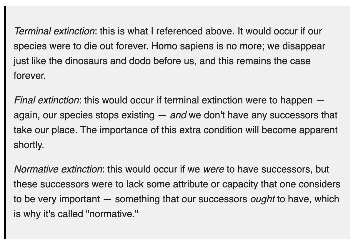 https://twitter.com/StopAI_Info/status/1927825757478473780two distinct extinction scenarios. The first--terminal extinction--would happen if our species were to disappear entirely and forever. The second--final extinction--adds an additional condition. It would happen if our species were to disappear entirely and forever *without* us