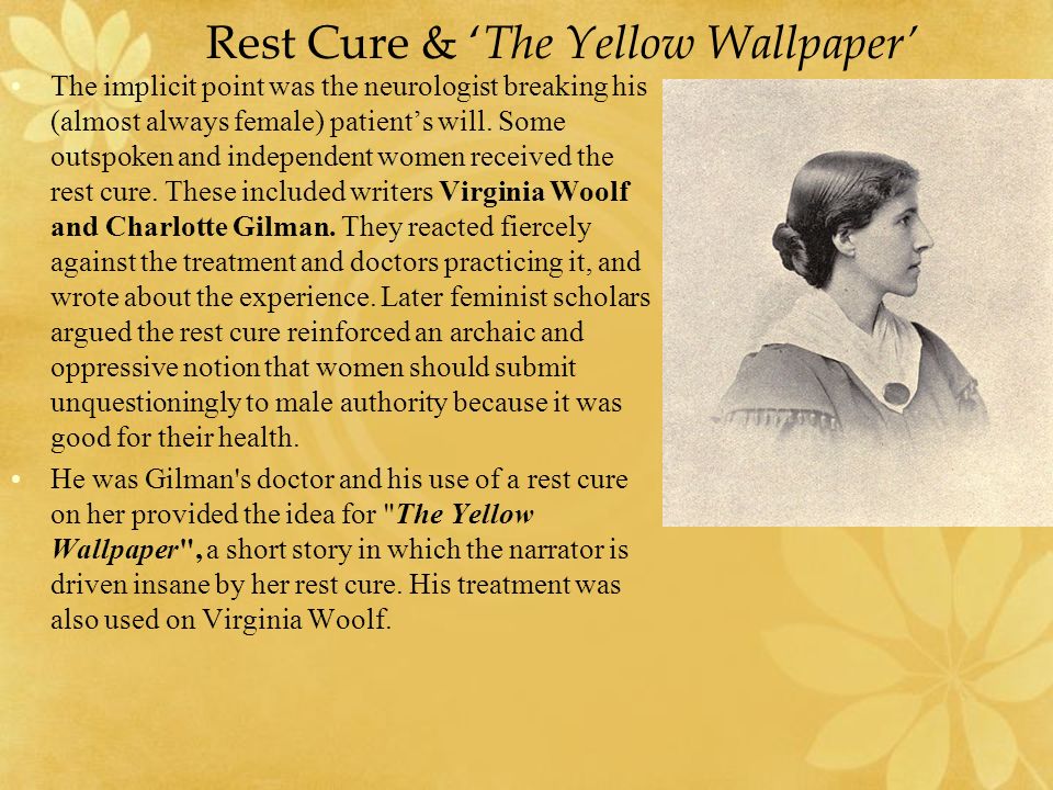 2-..Dr. Sir Weir Mitchell(Dr. M) tarafından uygulanmış bir tedavi yöntemidir. Gilman 1892'de yayınladığı "Sarı duvar kağıdı" adlı yarı-otobiyografik gotik öyküsünde, DT'ni,- suçladığı Dr. M'in adını vererek-, bir kurgu içinde eleştirerek anlatacaktır.