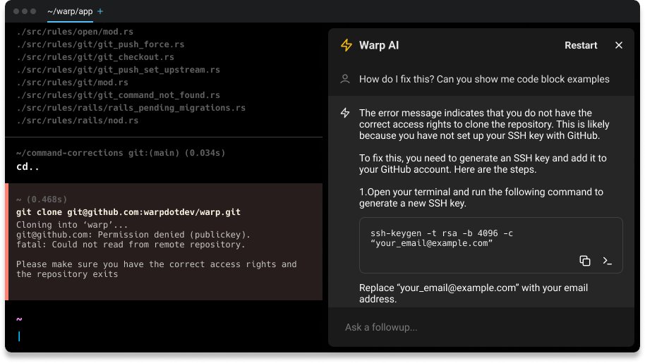 Warp AI can explain console errors, suggest fixes, write scripts, or walk you through complex installations. No external tools needed. No context switching.