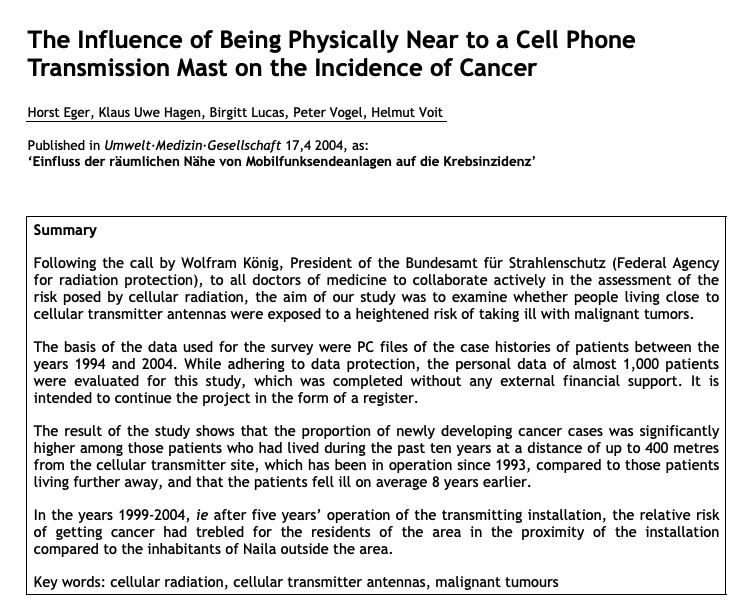 Residents within 400 m of the tower had more than 3x the cancer rate compared to those further away. Observed over 10 years.