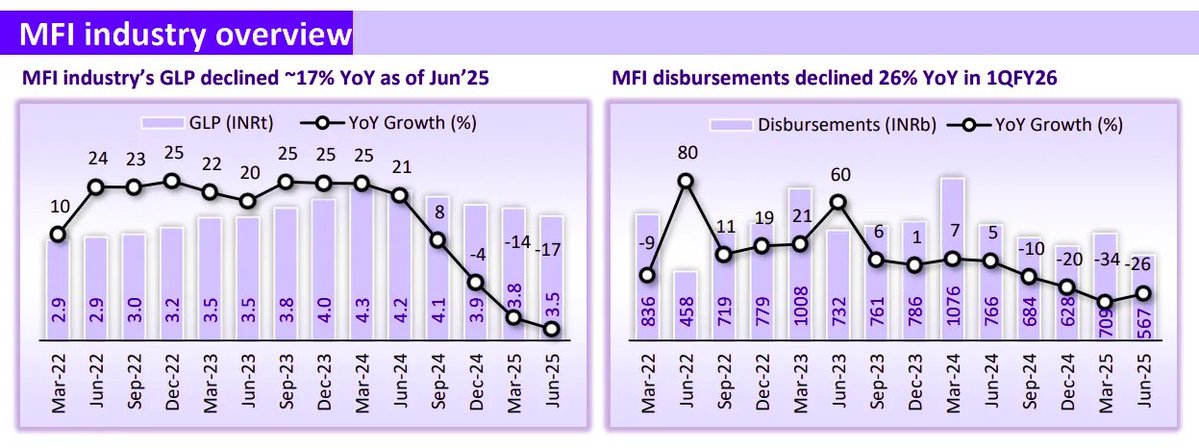 Microfinance in India has this pattern, it runs too hot, then too cold. After the pandemic, lenders went on a spree as money was cheap and demand was high. But maybe too cheap, borrowers took 5-6 loans from different lenders all at once.🧵👇