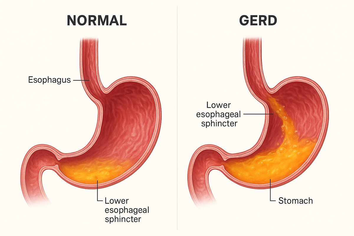 GERD is a chronic condition where stomach acid flows back into the esophagus (the food pipe).